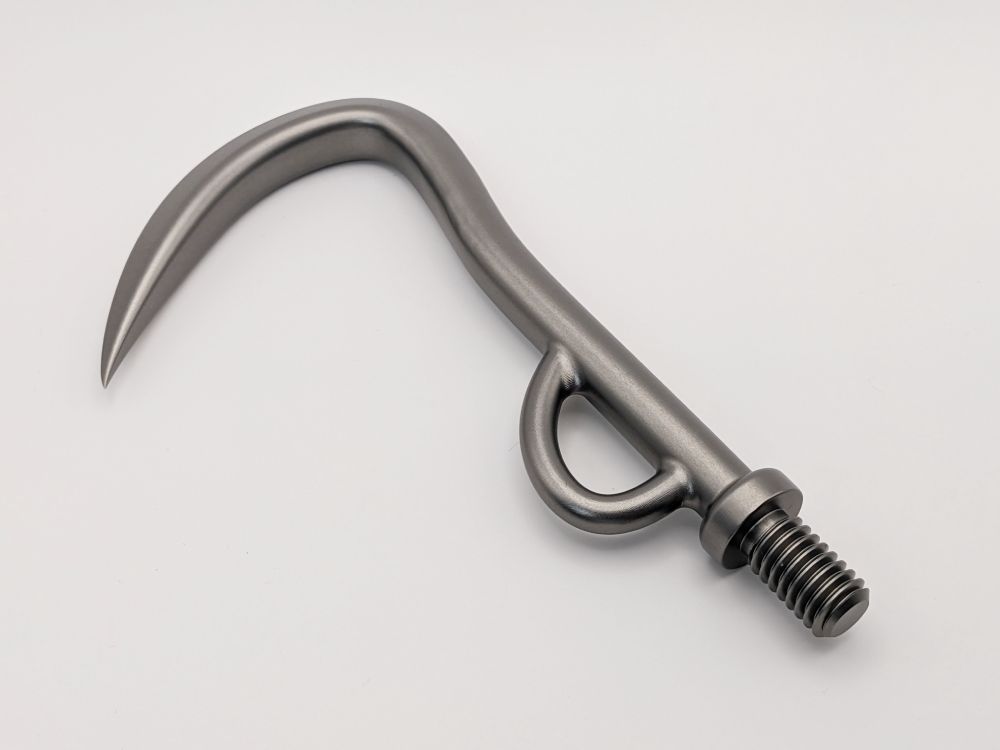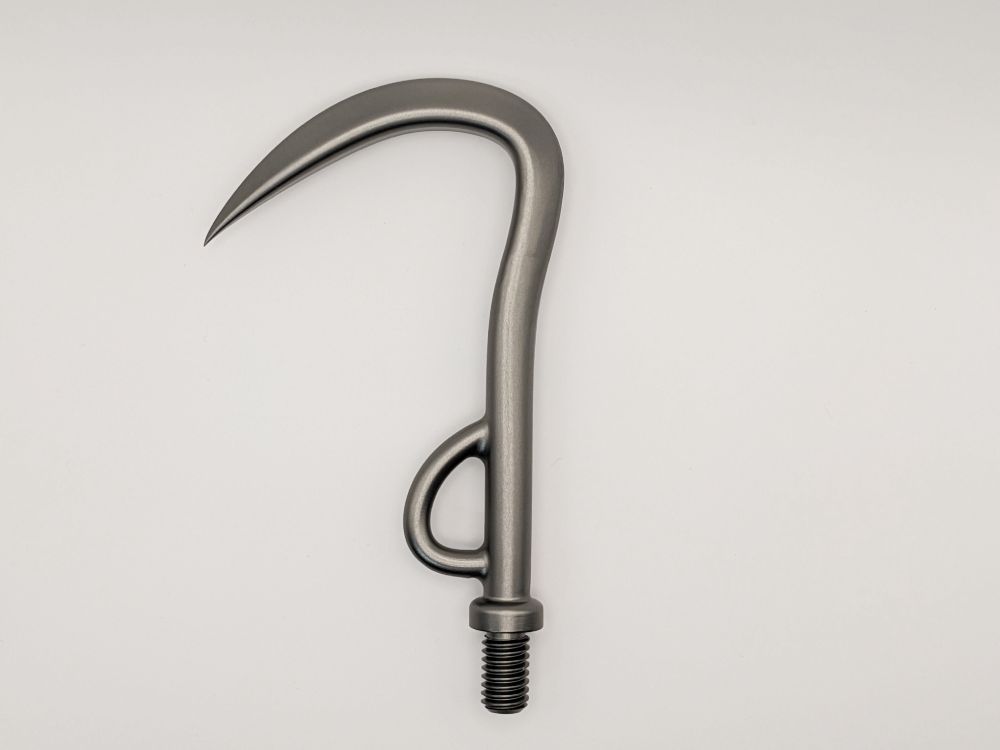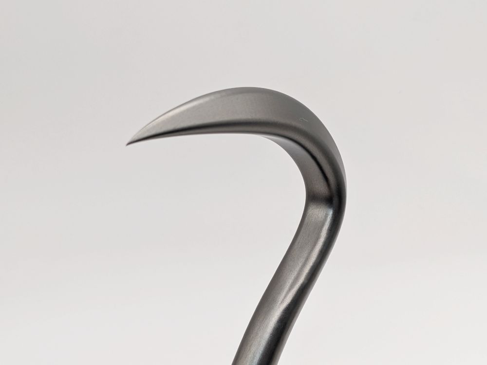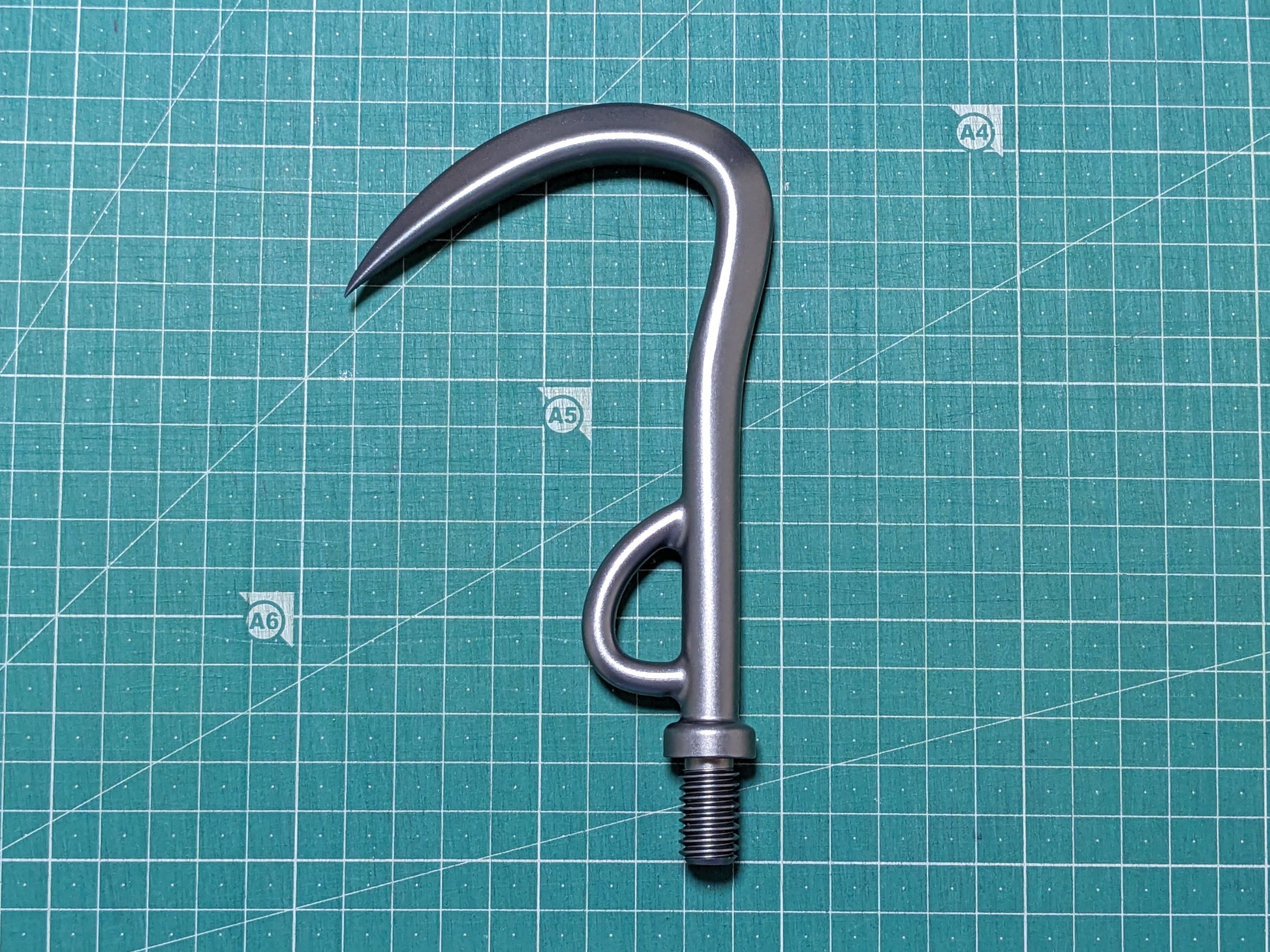 フトコロが浅いので引き上げ中に魚が暴れたら外れてしまうんじゃないかと不安に感じる方もおられると思いますが、クエの習性として、ギャフを掛けた後は基本的に暴れることはほとんとありません。ギャフをかけて引き上げる段階になると、いわゆる「根に張り付く」時の体勢をとり動きません。口を開け大きくエラ蓋を広げて体を曲げた姿勢をとりじっとしているのでフトコロは浅くても問題ありません。フトコロの深いギャフだと安心感がありますが、それよりもかけ易さを最優先した設計になっています。