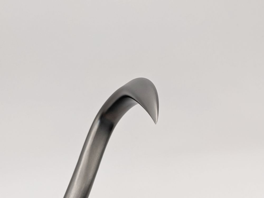 通常のギャフに比べ、柄に対してフックが横方向に向いているのでフッキングしやすく、特に口の内側から掛ける場合には格段に掛けやすい設計になっています。また、フックの内側を平面にすることで口以外に掛けた場合でも極力身切れを防ぎます。